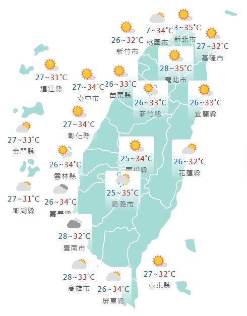 氣溫方面,各地高溫普遍為32至35度,台北、新北及彰化有局部地區可能出現36度以上高溫,中午前後紫外線偏強,容易達過量甚至危險等級,外出請做好防曬措施並多補充水分。