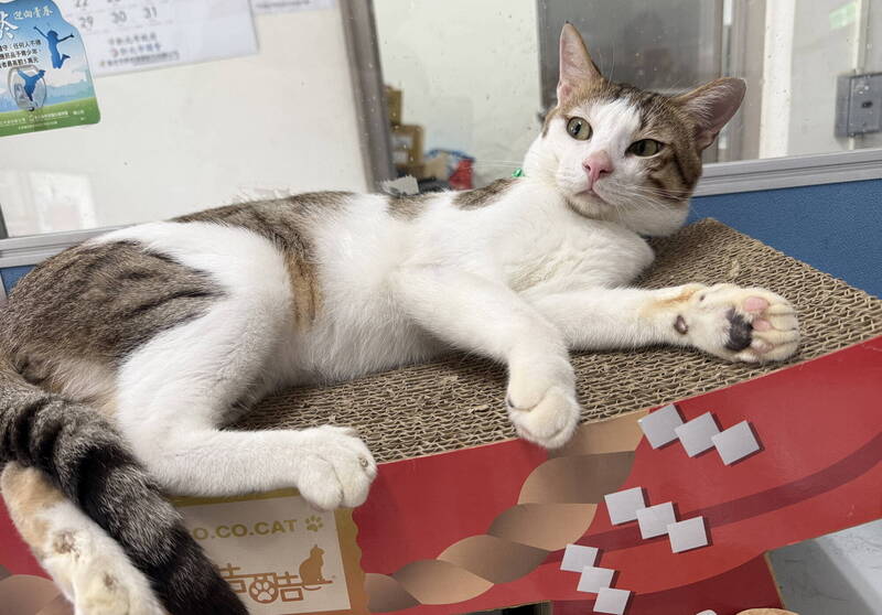 汐止區茄冬路有隻白底虎斑貓疑似車禍癱臥路旁,經動保處帶回治療後已經成功被認養。(新北市動保處提供)