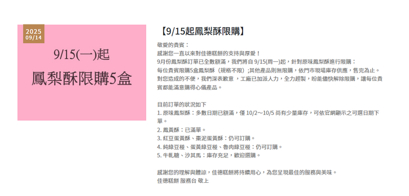 佳德糕餅表示,「敬愛的貴賓,感謝您一直以來對佳德糕餅的支持與厚愛!9月份鳳梨酥訂單已全數額滿,我們將自 9/15起,針對原味鳳梨酥進行限購。每位貴賓限購5盒鳳梨酥(規格不限),其他產品則無限購,依門市現場庫存供應,售完為止。對您造成的不便,我們深表歉意 ,工廠已加派人力,全力趕製,盼能儘快解除限購,讓每位貴賓都能滿意購得心儀產品。」