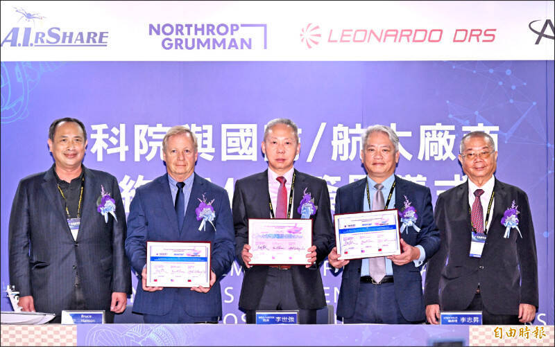 二○二五台北國際航太暨國防工業展登場,中科院院長李世強昨與美商安杜里爾(Anduril)、加拿大商艾爾夏(Airshare,暫譯)、義商美國子公司李奧納多 DRS(Leonardo DRS)、美商宇航環境(AeroVironment)、美商海事戰術系統(MARTAC)及美商諾格(Northrop Grumman)等六間國際廠商代表簽署合約與合作備忘錄(MOU),範疇涵蓋無人載具及遊蕩彈藥、戰車升級、無人機反制與整合指揮系統的合作研發、生產及採購等,為台灣國防自主、國際合作邁出一步。