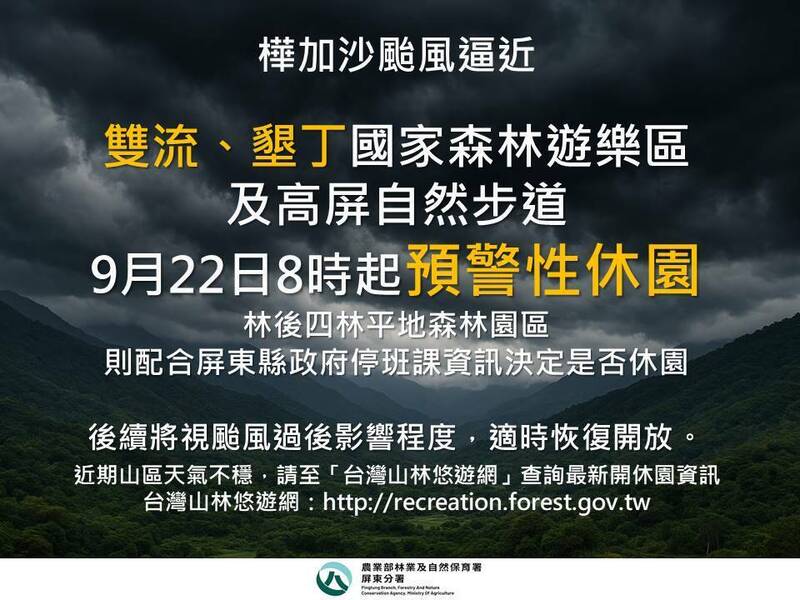 樺加沙颱風來襲,今天上午發布海上颱風警報,預計明晚發布陸上颱風警報,林業保育署屏東分署轄內森林遊樂區及自然步道自明天(22日)8時起預警性休園,開放日期另行公告,若提前發布陸上颱風警報,警戒區域則配合立即休園。