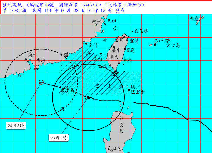 今天清晨7時氣象資料,樺加沙為強颱等級,位於鵝鑾鼻西南方約340公里處海面,近中心最大風速每秒58公尺,相當於17級風;瞬間最大陣風每秒73公尺,相當於17級風以上;七級風平均暴風半徑320公里,十級風平均暴風半徑150公里。以每小時21公里速度,向西北西走。陸警區域為恆春半島;降雨警戒區域為花蓮縣、台東縣;海警區域為台灣海峽、巴士海峽、東沙島海面。