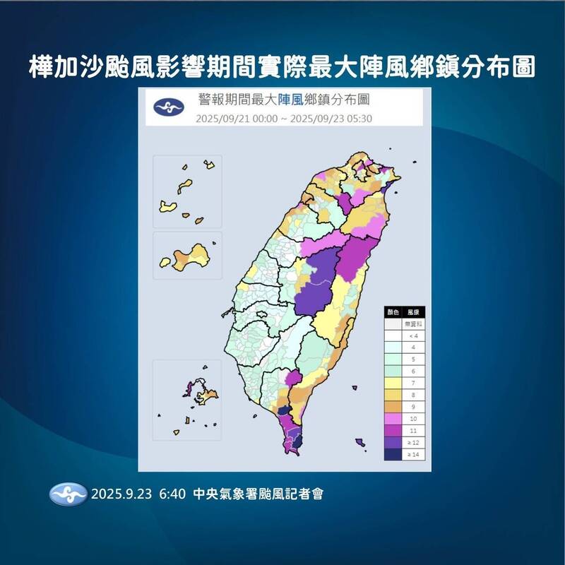 樺加沙颱風影響台灣,中央氣象署說明風力情況。圖為9月22日上午6點40分發布。(氣象署提供)