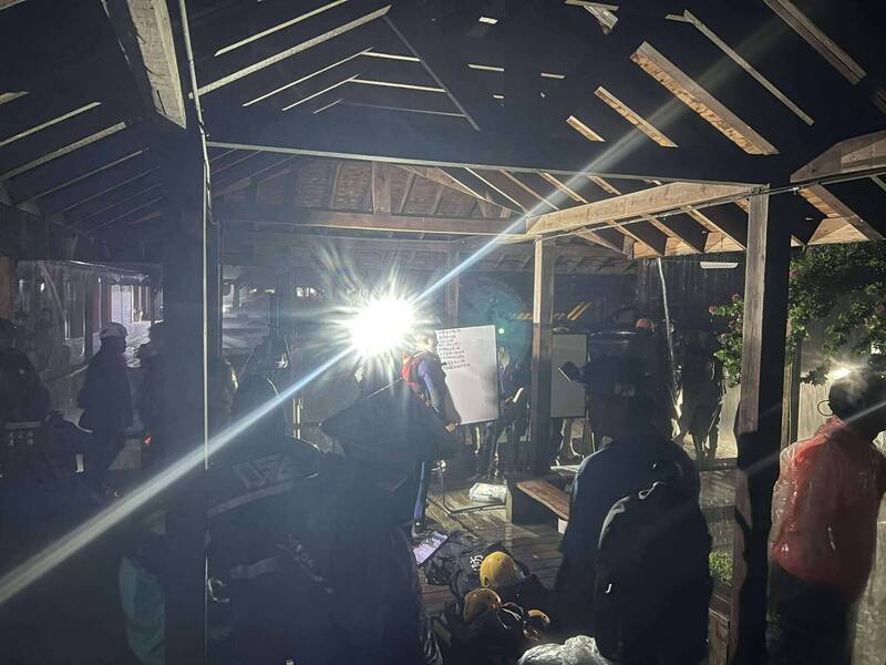 消防局義消及警消集結在光復糖廠停車場,等水退進入救援。(民眾提供)