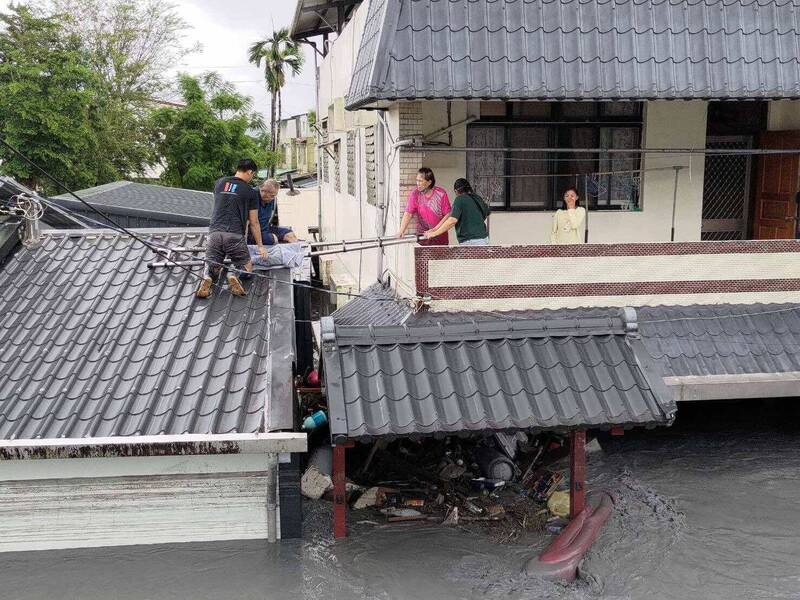 光復鄉市區大淹水,許多房子一樓幾乎淹沒直到屋頂,鄉民下樓移車都來不及,躲在民宅二樓避難。(民眾提供)