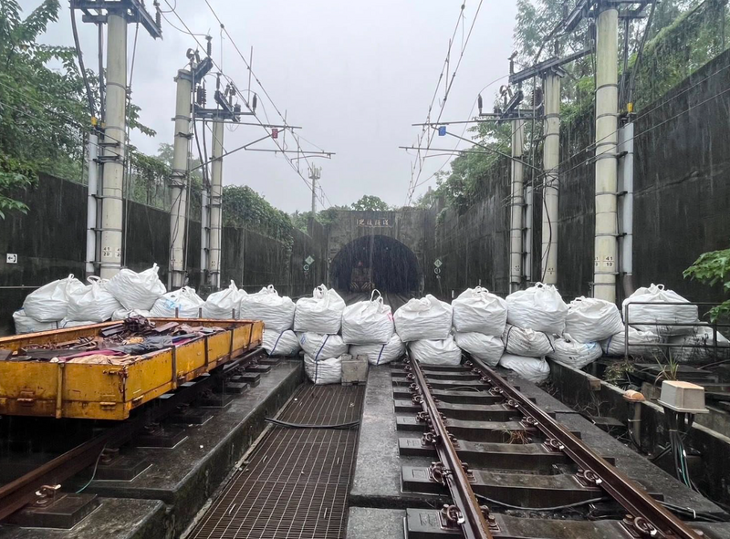 台鐵人員事先在光復隧道入口處堆置太空包。(圖翻攝自沈慧虹臉書)
