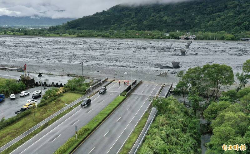 馬太鞍溪上游堰塞湖23日下午潰流洪水沖斷花蓮光復馬太鞍溪橋。(記者羅沛德攝)