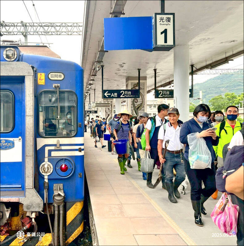 馬太鞍溪堰塞湖近日潰流,洪水泥流衝襲光復鄉,造成嚴重災情,許多民眾自發性到花蓮光復鄉協助救援。(台鐵公司提供)