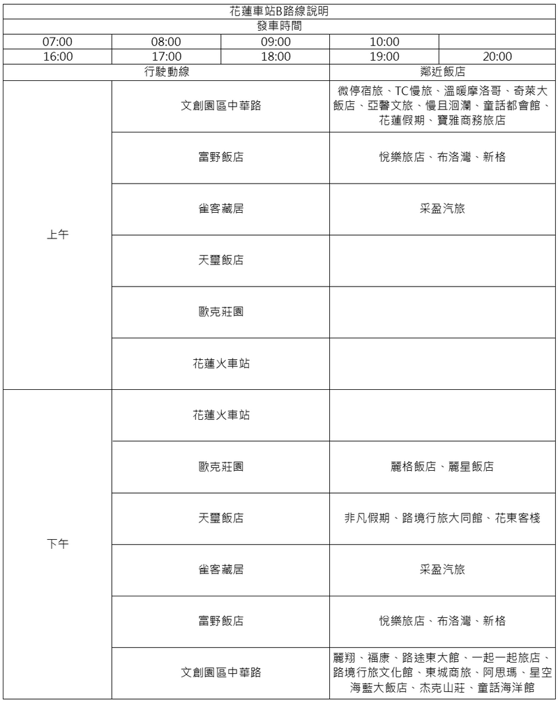 公路局表示,大客車接駁專車皆免費,觀光署花東縱谷國家風景區管理處每天於光復車站,針對有住宿需求的志工媒合住宿地點,並確認接駁需求後,將資訊提供公路局,公路局並於新城、花蓮、吉安、壽豐及玉里站,每天共提供6輛大客車,闢駛6條服務路線,接駁救災志工住宿點往返鄰近火車站,服務時段為上午7至10時,以及下午4時至晚間8時,每小時發車。