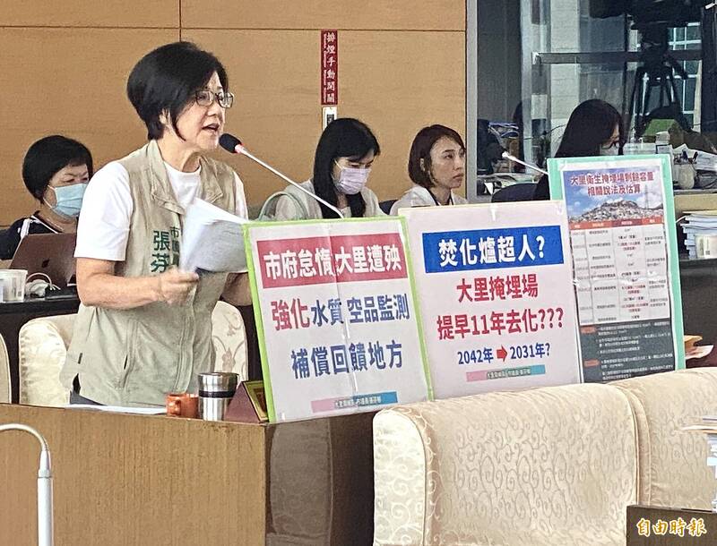 大里衛生掩埋場堆置約38.5萬噸垃圾,民進黨多名議員在台中市議會輪番砲轟市府團隊,大里區議員張芬郁播放影片,稱垃圾山流出「潺潺流水」,要求台中市長盧秀燕答詢,盧秀燕稱「新的(文山焚化廠BOT案)營運前總是會有周轉情況」。張芬郁回稱,環保局長(陳宏益)5年內可去化大里垃圾,等於是原先時程提前11年,她酸真的是「是焚化爐超人」?市府應該要好好嘉許。