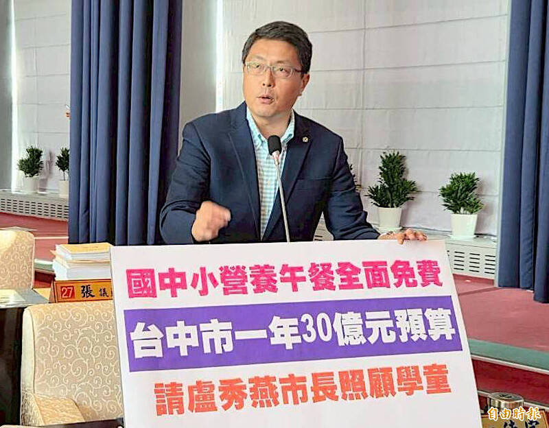 林德宇指台中市營養午餐全面免費1年預算要30億元,現行午餐補助政策14億元,預算差額16億元,呼籲市長盧秀燕在任內最後1年任內實施。(記者蔡淑媛攝)