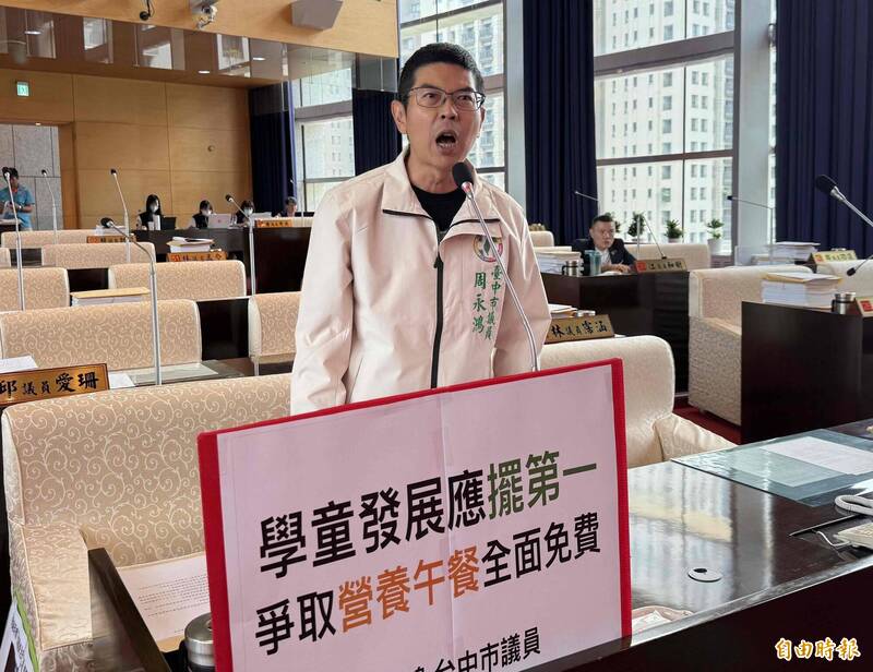 民進黨議員周永鴻也爭取中市學童營養午餐免費,強調學童發展應擺第一,並反駁市長盧秀燕稱免費營養午餐國立學校也沒有、不是法定福利等說法是邏輯不通,而是中市府自行規劃執行的補助項目。