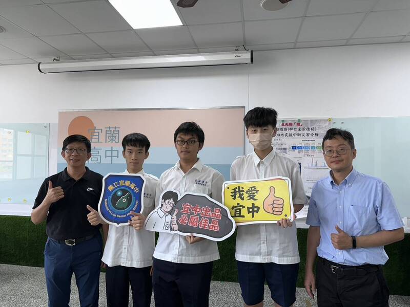 宜蘭高中校長洪光賢(左起)和蔡定融、吳羽翃、曾柏承及指導老師周士堯合影。(宜蘭高中提供)