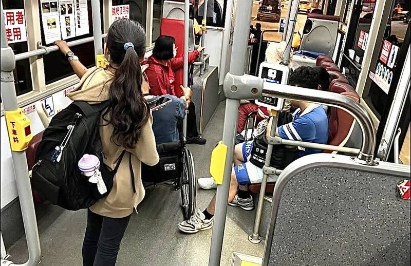 「潔媽」表示,3日在台中高鐵站搭公車時,看見司機推著獨行老先生上車,並特地將輪椅斜放,避免滑動,老先生自己調整方向,雙手緊緊抓住把手固定身體。一旁熱心乘客關心詢問,他也婉拒協助,堅持靠自己。