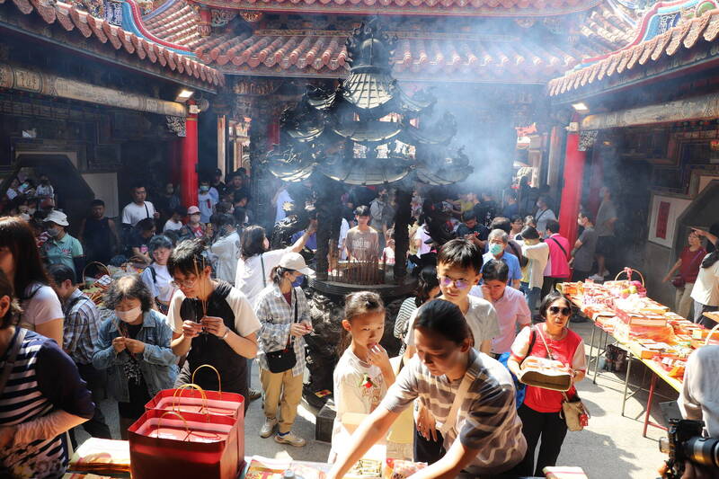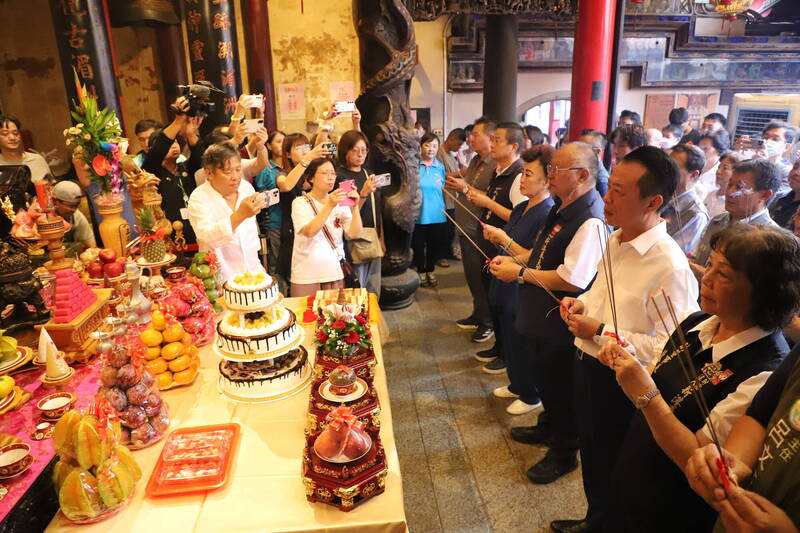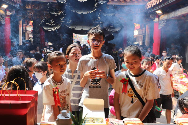 新港奉天宮契子女在中秋節向媽祖祭拜。(嘉義縣政府提供)