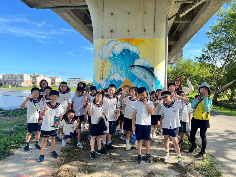 學生走讀活動也到鐵路高架橋墩彩繪步道參觀,了解步道由來與地方特色。(鎮安廟提供)