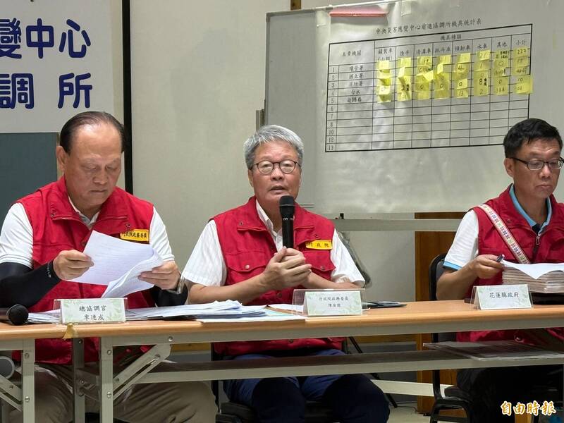 行政院政委陳金德出席中央「光復鄉災後復原專案中央前進協調所」記者會,說明申辦服務進度。(記者王峻祺攝)