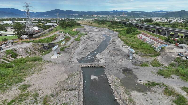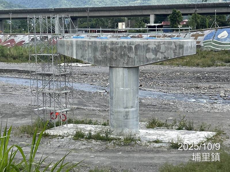 南投縣埔里鎮守城橋目前已完成橋墩工程,正在製作鋼構橋身,預計11月底吊裝,明年3月底完工。(南投縣政府提供)