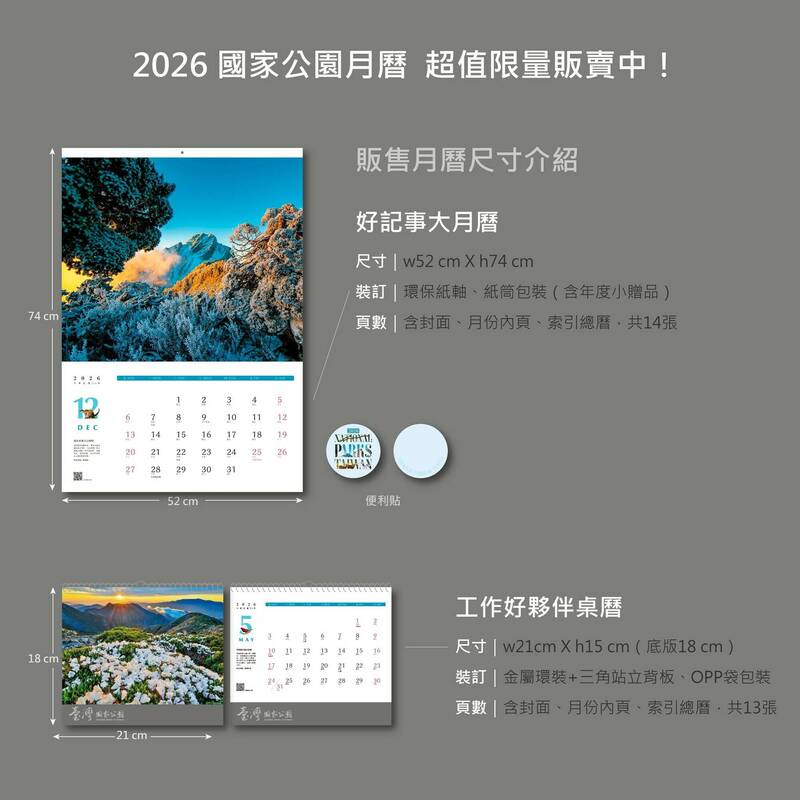 國家公園署指出,2026年「台灣國家公園月曆及桌曆」即日起開放預購,月曆每份售價為220元,桌曆每份定價為150元,民眾可至國家書店、五南文化廣場、三民書局等販賣通路購買,預計11月15日起正式供貨。