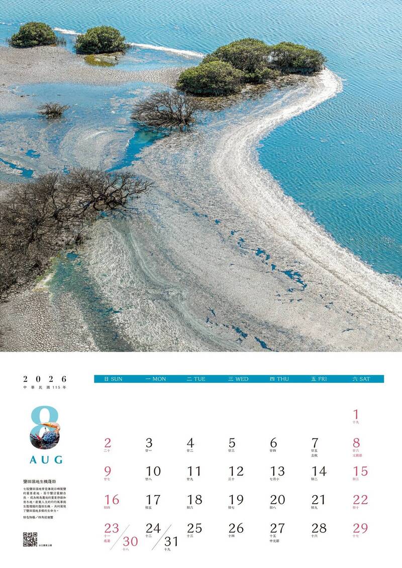 代表月份的字體更藏有驚喜!國家公園署表示,各月份字體融合如台灣朱雀、四角招潮蟹、黃喉貂、棋盤腳等代表性物種,各種鳥類、哺乳動物、濕地生物與花卉藏身其中,整套月曆不僅是日期記錄工具,更像一場多面向的自然旅程,感受國家公園無窮的魅力。
