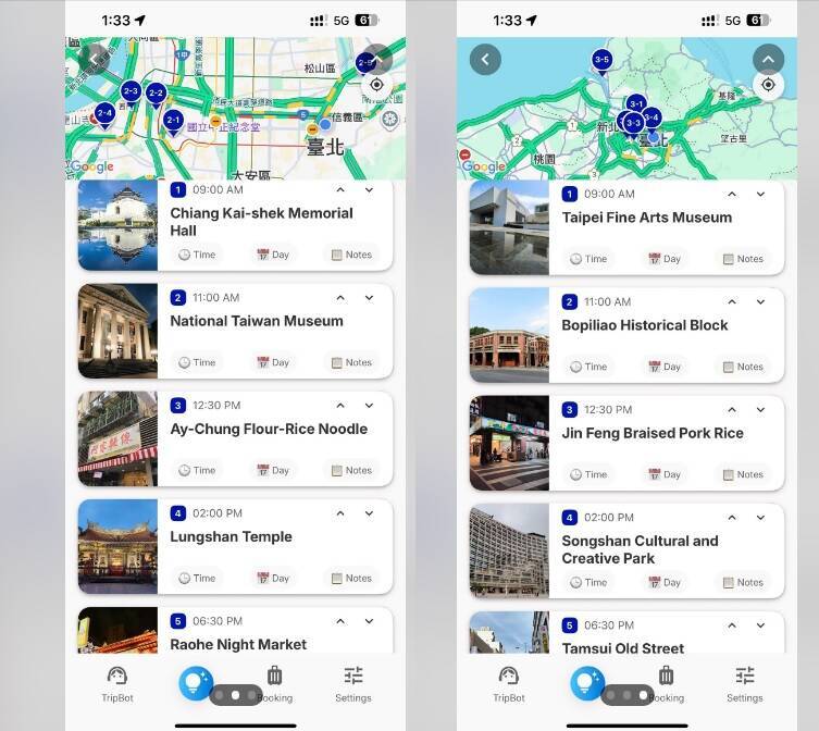 從他附上的圖片可見,「AI TripBot」第一天行程幫他設計了早上象山、台北101的行程,中午12點30分到101的鼎泰豐用餐;下午2點30分則是參觀故宮博物院,下午6點30分去逛士林夜市。由此可見,扣除交通時間,他大概只有4小時能參觀故宮博物院。