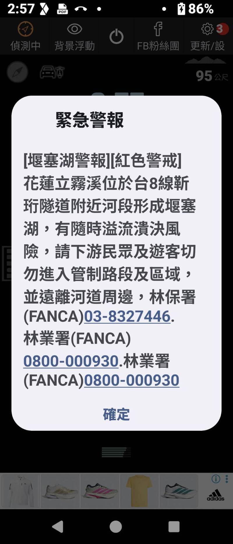 花蓮縣秀林鄉立霧溪、台8線靳珩隧道口的舊台8線路段,發生山壁崩塌阻塞立霧溪河道形成堰塞湖,林業署花蓮分署緊急派員勘查,發現堰塞湖長度800公尺,今天傍晚可能就漫淹台8線公路;公路局下午表示,目前水位距離靳珩隧道西口路面約只有2.5公尺,已成立前進指揮所並發布紅色警戒的緊急警報、細胞簡訊CMS、警廣vpn、幸福公路APP,呼籲民眾不要進入該路段。