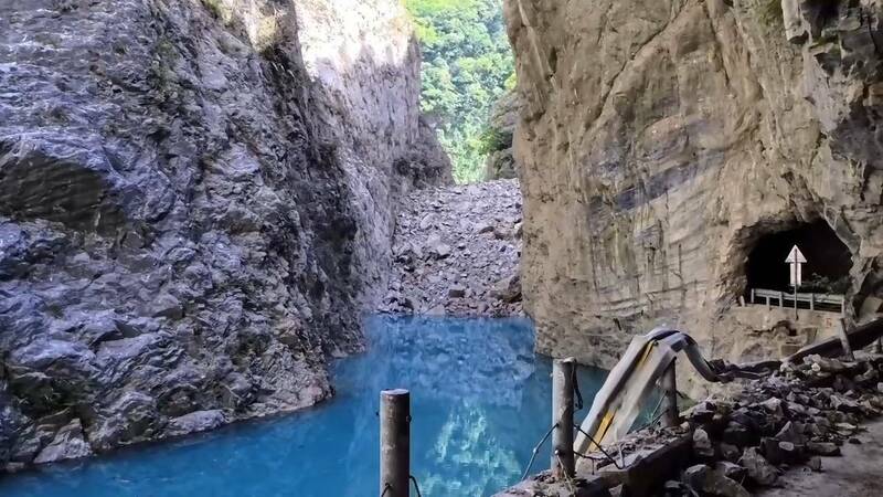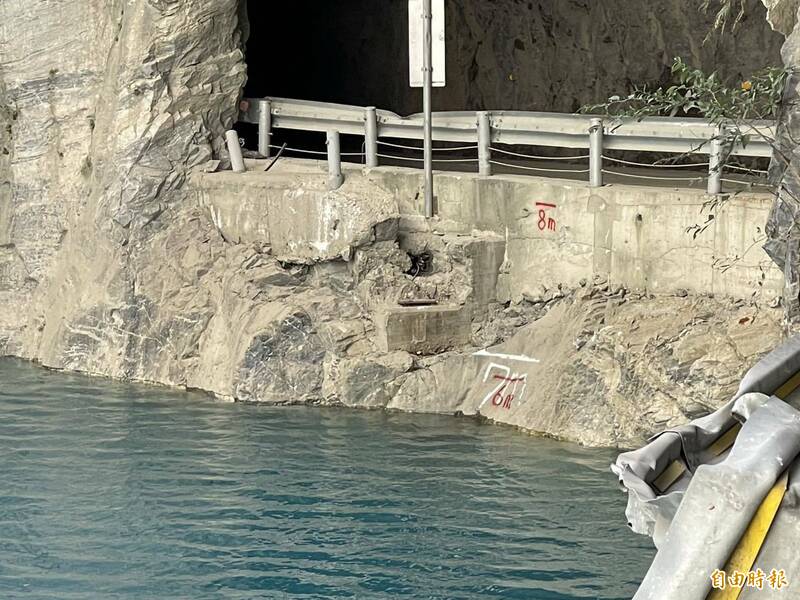 立霧溪靳珩隧道東口,燕子口步道已經被溪水吃掉了,5點鐘左右已經與公路齊平。(公路局提供)