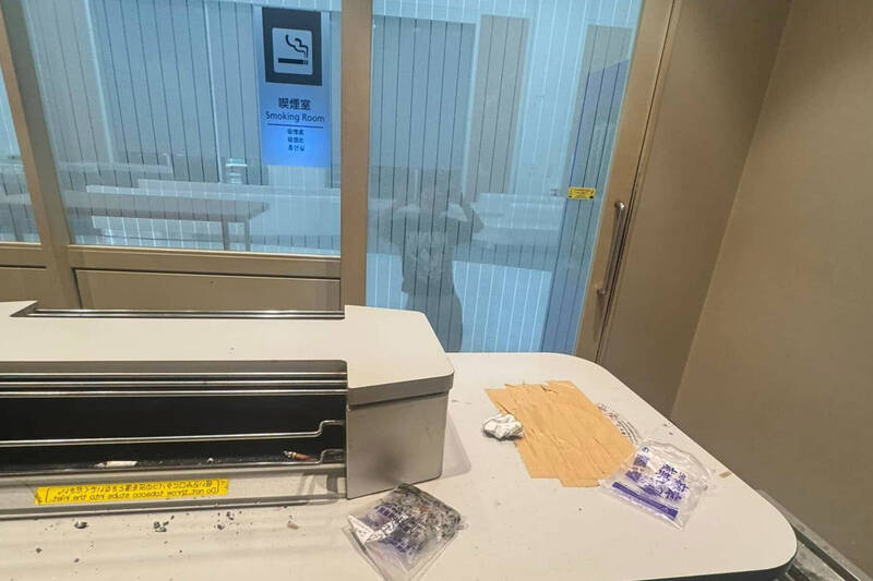 旅客在日本沖繩機場吸菸室發現來自台灣的檳榔袋。(擷取自爆料公社)