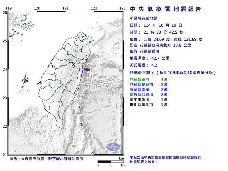 根據中央氣象署資料顯示,今晚21時33分在花蓮縣近海發生芮氏規模4.2地震,地震深度為42.7公里,震央位於花蓮縣政府東北方13.6公里。