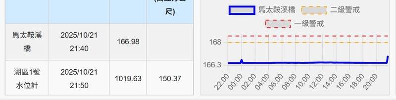 馬太鞍溪上游第二堰塞湖晚間疑開始溢流,馬太鞍溪水位計開始升高。(翻攝國有林防災應變及堰塞湖監測系統)