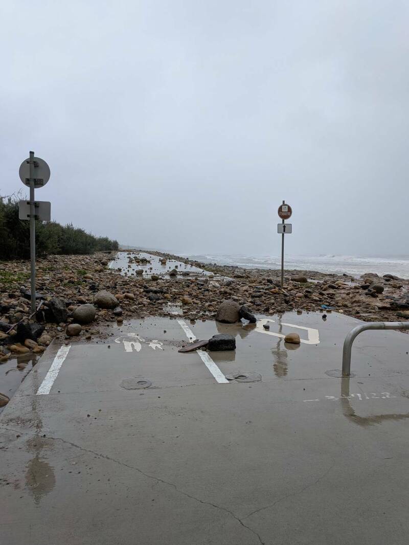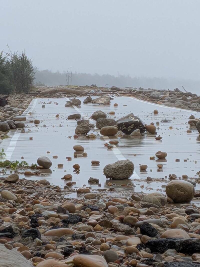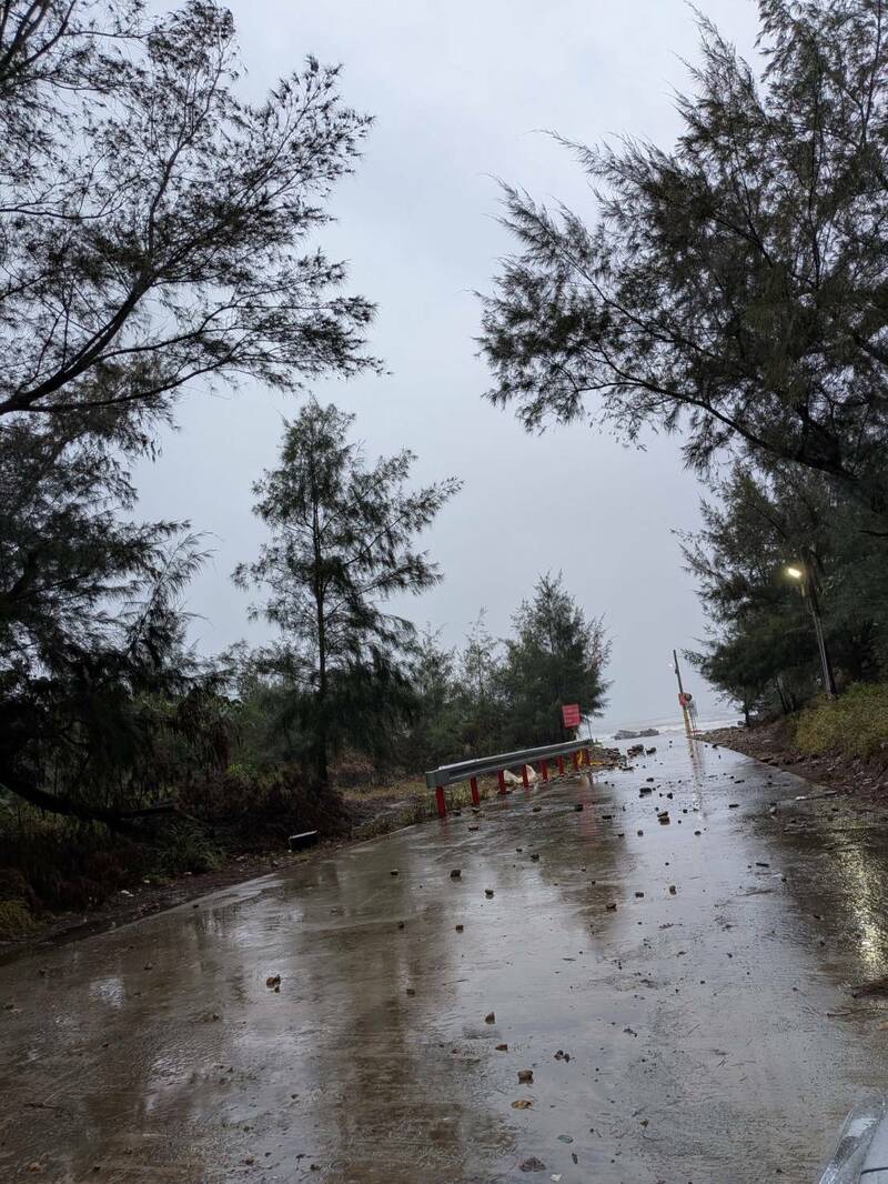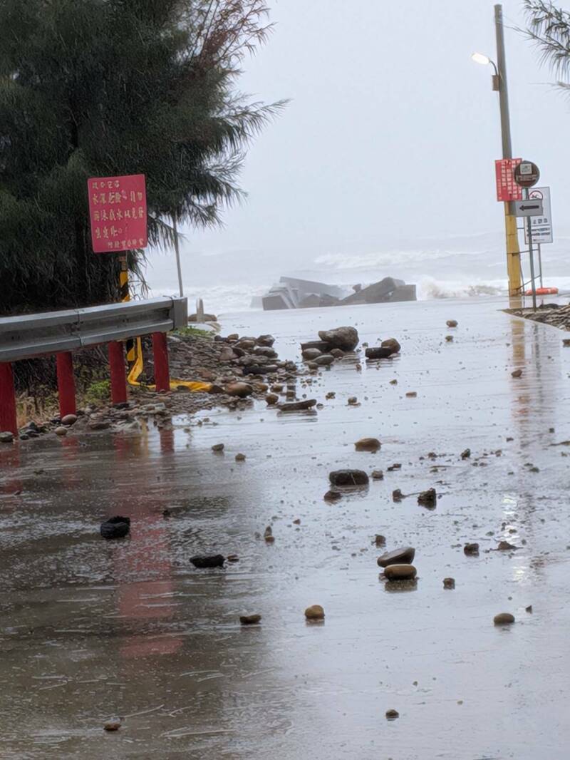 新竹縣竹北市尚義里長曾福表示,受東北季風影響,昨漲潮期間海水倒灌,因缺乏堤防阻攔,海浪夾雜泥沙和石頭直接侵入海岸行人和自行車道。(尚義里長曾福提供)