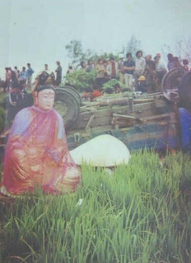 民國70年左右,一輛載著觀世音菩薩神像的貨車,行經竹塘鄉時失控翻落稻田,車子四輪朝天,觀世音神像直挺挺立在車前,鄉民認為是神蹟,因此在車禍地點興建「慈航宮」(慈航宮提供)