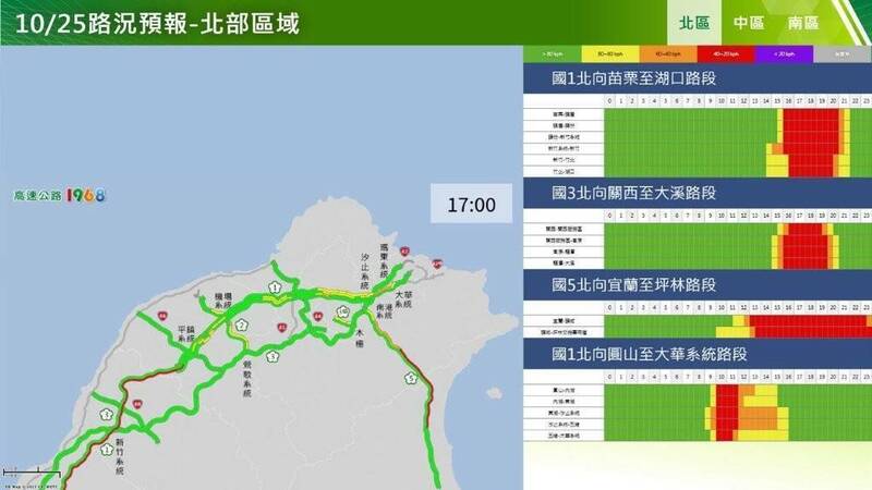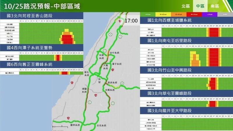 高速公路局預判,明天重點壅塞路段為國1南向楊梅─新竹、彰化系統─埔鹽系統、路竹─岡山,北向西螺─埔鹽系統、南屯─后里、苗栗─湖口、圓山─大華系統;國3南向土城─關西、快官─霧峰,北向竹山─中興、草屯─霧峰、大山─香山、關西─大溪。