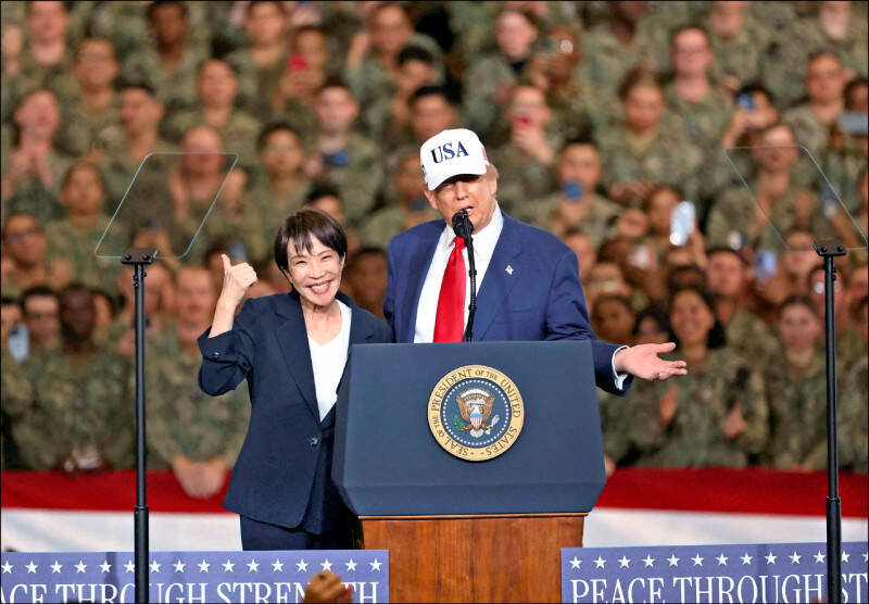 日本首相高市早苗28日與美國總統川普,一同登上橫須賀海軍基地的美國航空母艦「喬治華盛頓號」,高市向美軍表示,將與美國攜手確保區域的和平與安全。(路透)