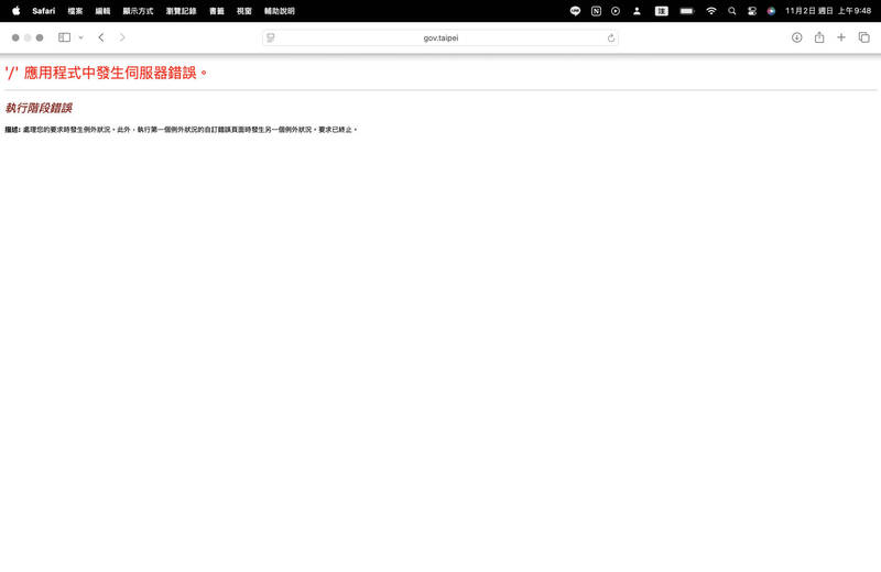 今(2)早台北市政府以及各個局處網站皆顯示「執行階段錯誤」,無法正常進入網站。(截自台北市政府官網)