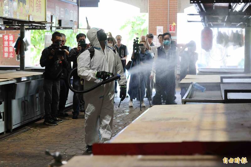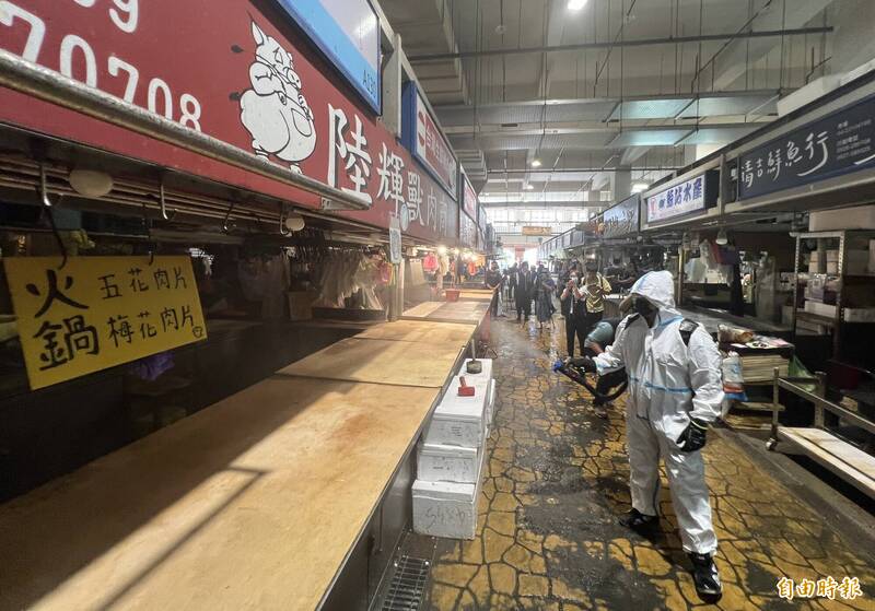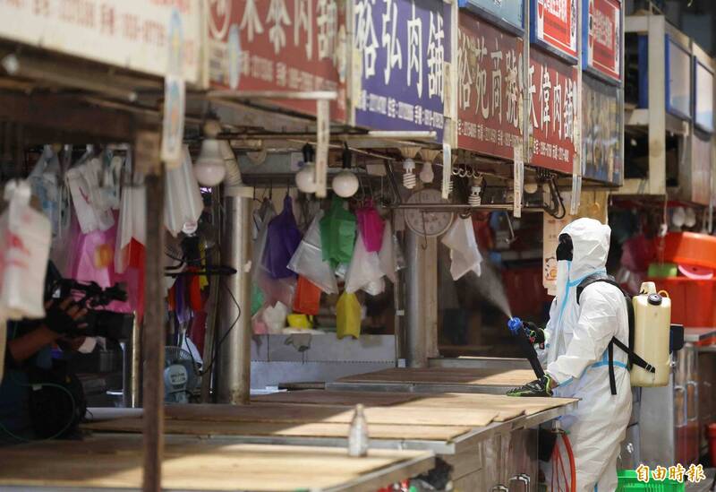 建國市場展開消毒防疫,準備7日開市。(記者蔡淑媛攝)