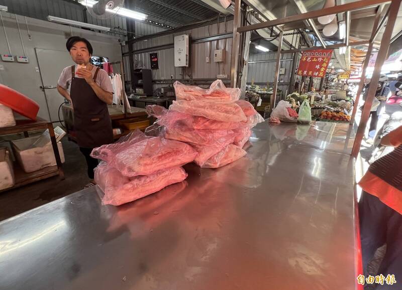 豬瘟抗疫多日,明天凌晨豬肉將恢復運宰,市場豬肉攤商販售多日的冷凍豬肉,終於迎來「春天」。(記者廖耀東攝)