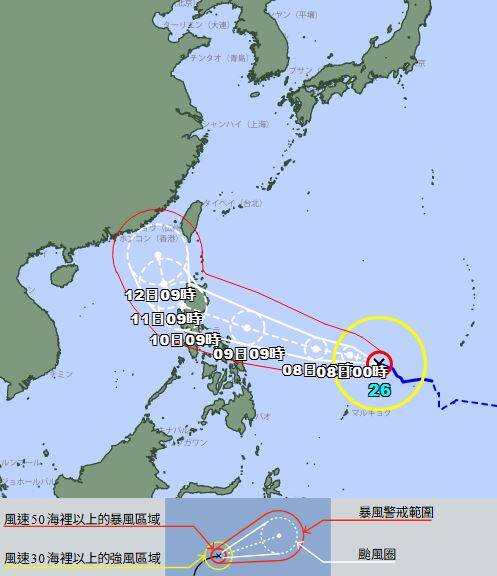 日本氣象廳最新路徑預報,已將台灣南部列入暴風警戒範圍。(取自日本氣象廳)
