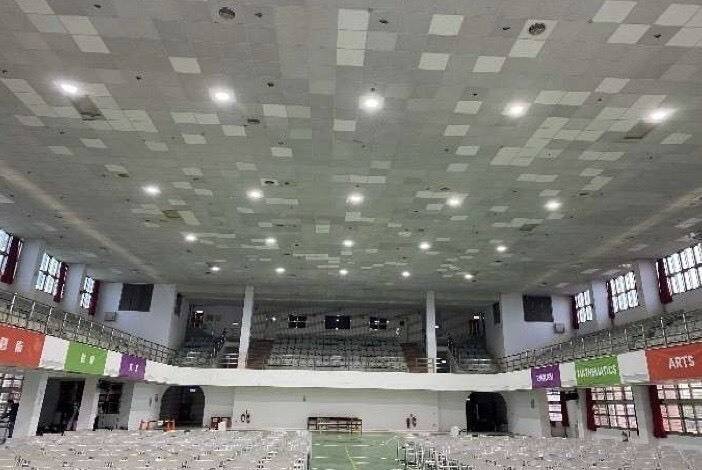 大業實中活動中心輕鋼架天花板掉落,修補如「補丁」。(郭定緯服務處提供)