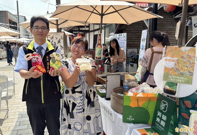 台南市副市長葉澤山(右)稱讚下營紅厝社區以打面宋江推出文創品和小旅行。(記者楊金城攝)