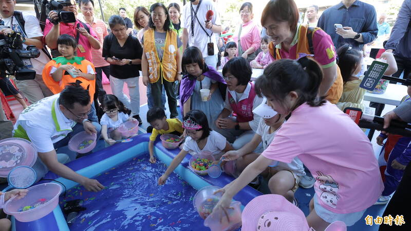 立委蘇巧慧、新北市議員翁震州和小朋友一起在氣墊池玩遊戲。(記者黃政嘉攝)