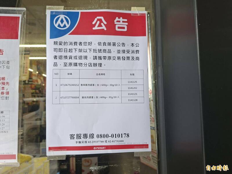 全聯在各門市貼上問題雞蛋已下架且接受退貨的公告。(記者蘇金鳳攝)