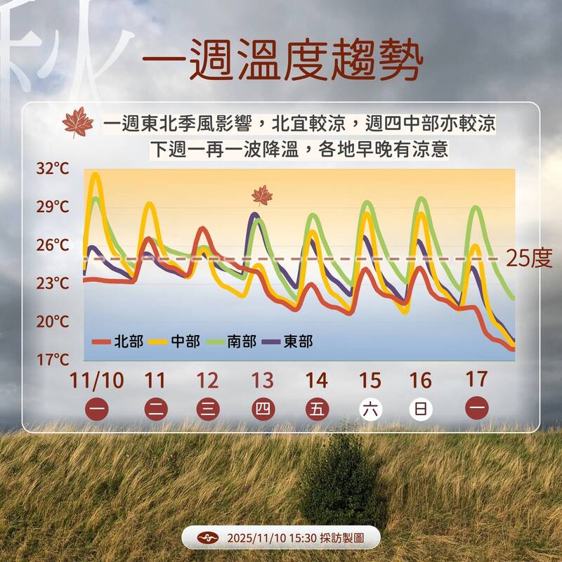溫度方面,東北季風及雨勢影響,今天至週四,北台灣白天25、26度,整天偏涼;週四東北季風增強,中部氣溫下滑;週末北台灣略回升但早晚偏涼,下周一新一波東北季風增強,溫度明顯偏涼。