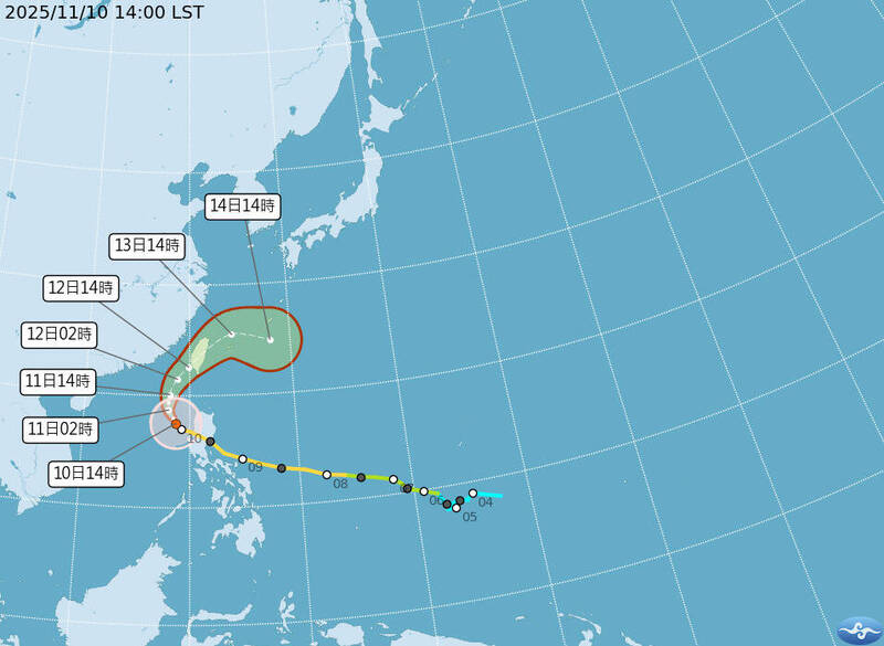 鳳凰颱風朝台灣靠近。圖為11月10日下午2時的颱風路徑潛勢預報。(氣象署提供)