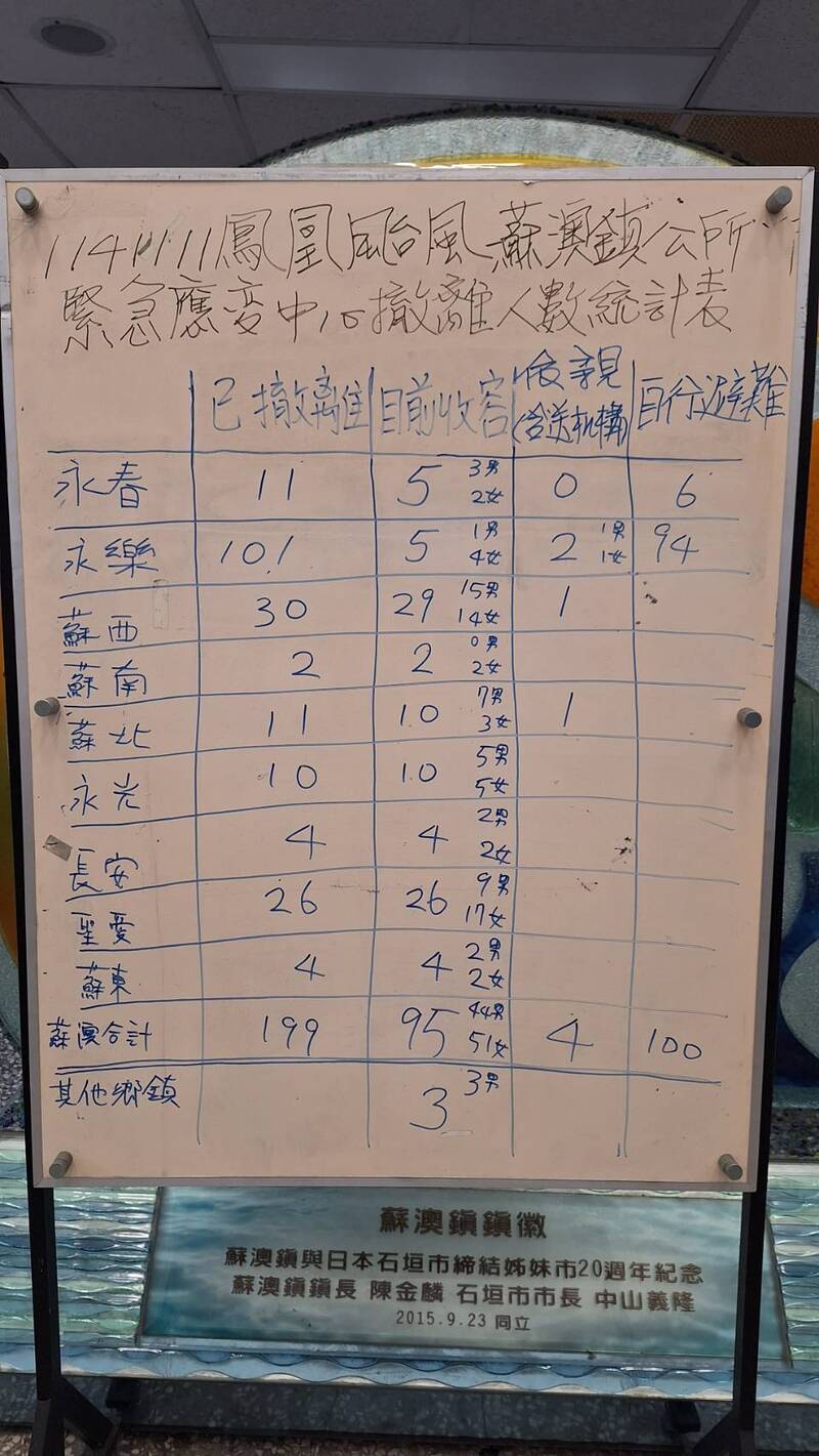 蘇澳鎮撤離收容人數統計表。(蘇澳鎮公所提供)