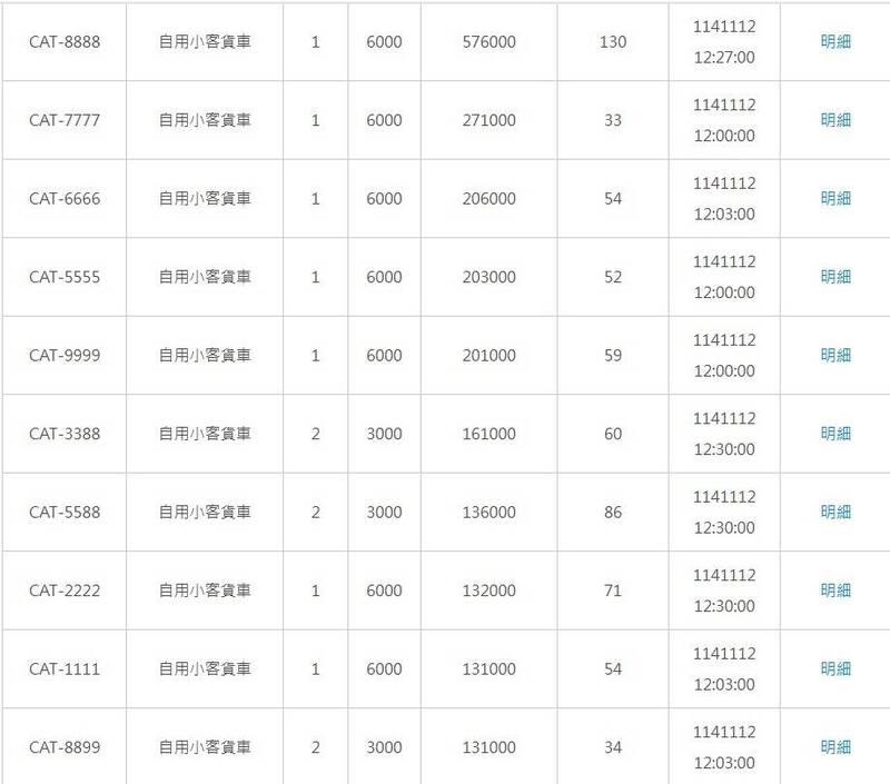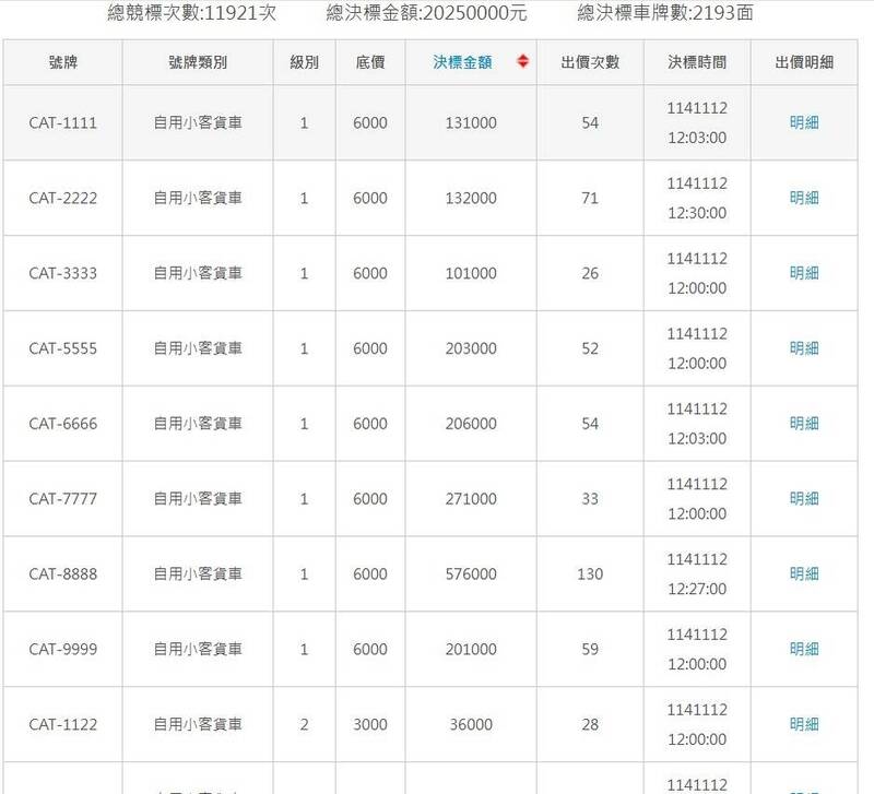 根據監理服務網統計,「CAT」車牌總決標金額達2025萬,標出2193面車牌。其中決標金額最高的是「CAT-8888」,被競標達130次之多,最終以57.6萬元決標。金額第二高是「CAT-7777」,決標金額27.1萬元。