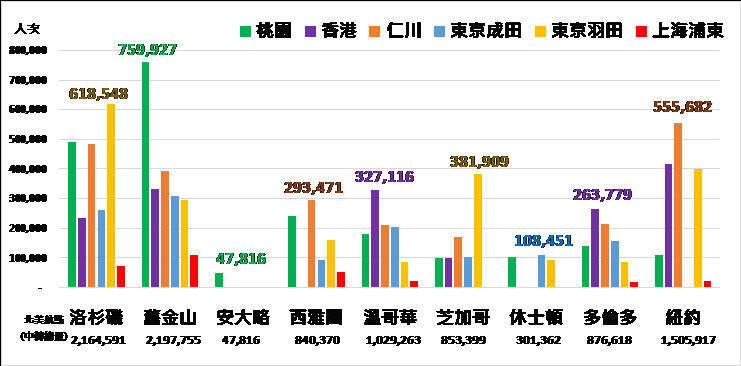 在轉運總量方面,舊金山航線220萬人次最多,其後依序為洛杉磯216萬、紐約151萬、溫哥華103萬、多倫多88萬、芝加哥85萬、西雅圖84萬、休士頓30萬、安大略4.8萬;其中桃園機場以往舊金山航線轉運旅客量76萬最高,為所有航線之冠。