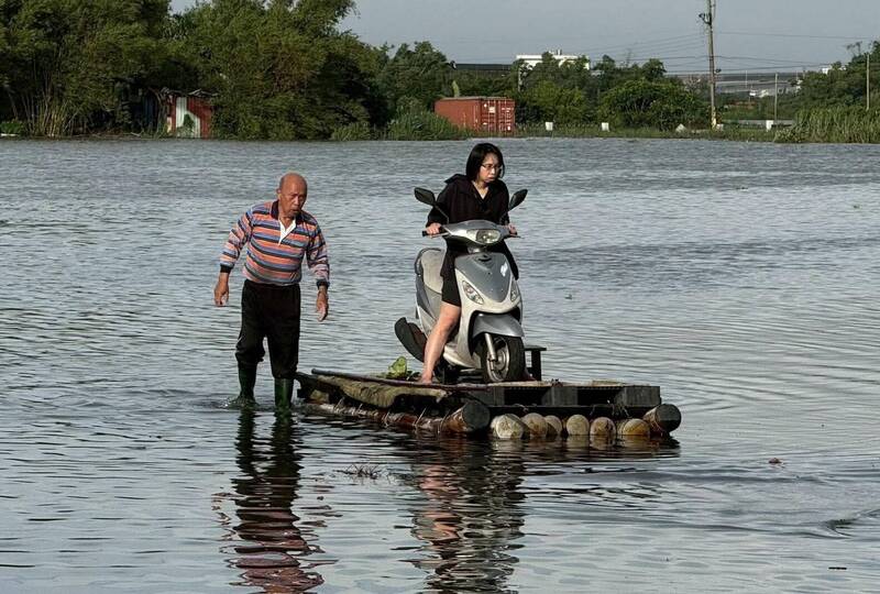 五結鄉五十二甲濕地一帶,昨天經過大雨襲擊淹水嚴重,一名林姓護理師要赴醫院上班,但道路淹水及膝,車輛無法進出,父親使用竹筏運送,護理師連人帶車騎上竹筏渡水,父親神情緊繃涉水警戒。五結鄉民代張亮軒拍下影像上網,網友大讚護理師敬業,父親全力護送女兒畫面也很感人。