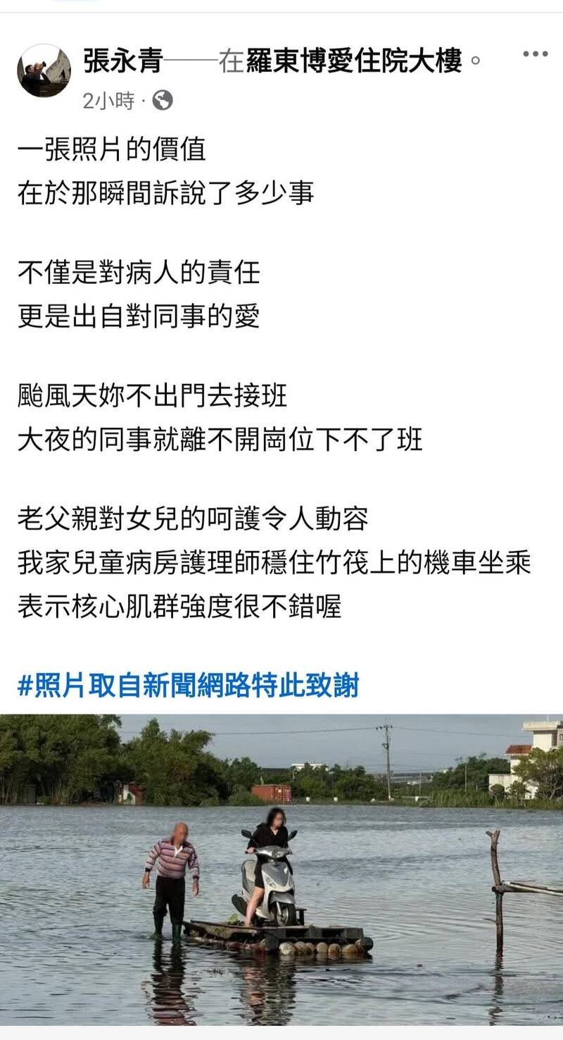 張永青在文中指出,「一張照片的價值,在於那瞬間訴說了多少事,不僅是對病人的責任,更是出自對同事的愛,颱風天妳不出門去接班,大夜的同事就離不開崗位下不了班,老父親對女兒的呵護令人動容,我家兒童病房護理師穩住竹筏上的機車坐乘,表示核心肌群強度很不錯喔」。