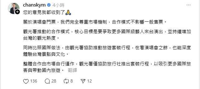 陳世凱回應追星人「合作模式不影響一般售票」。(圖擷取自@chanskym社群平台「Threads」)